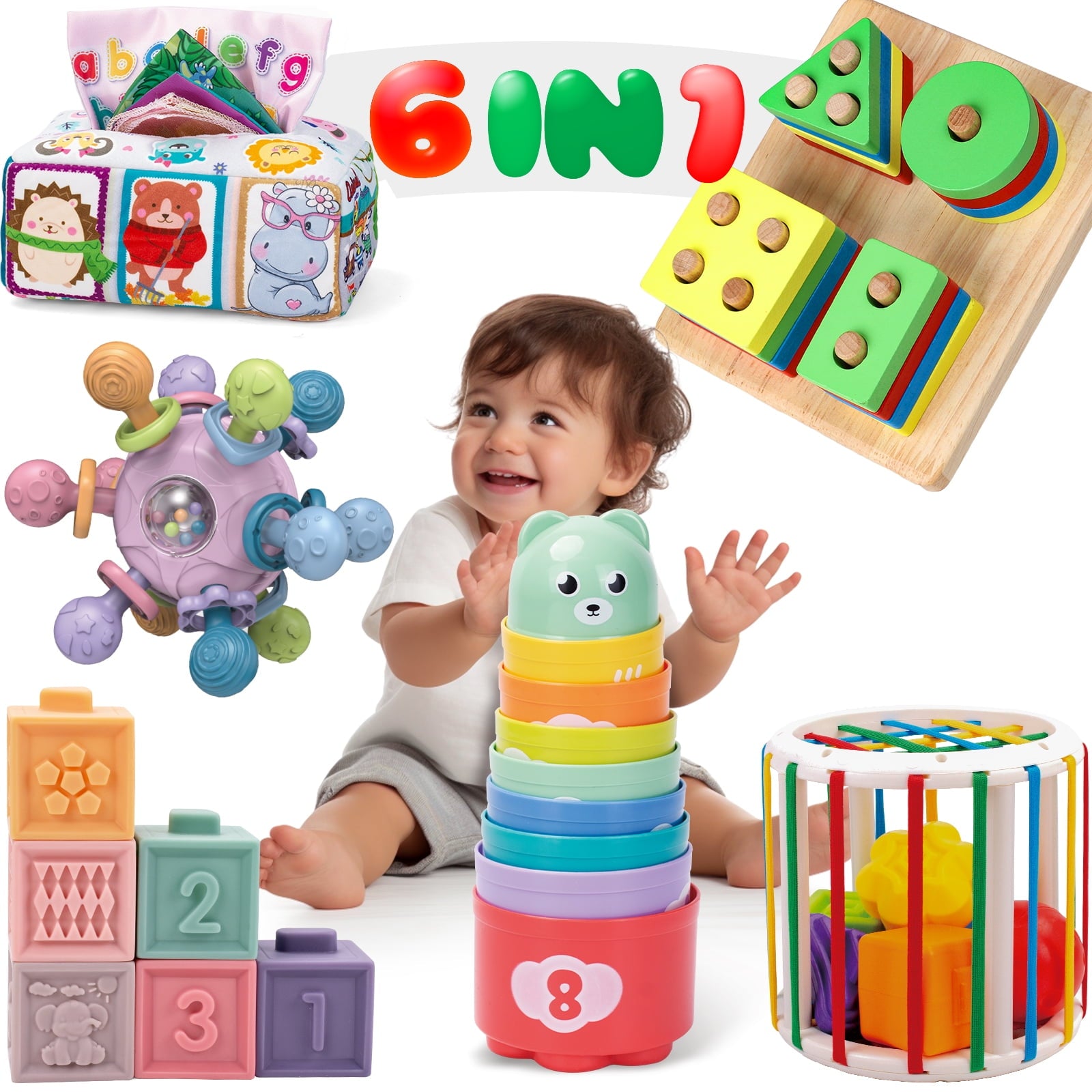 - 【6 IN 1 Soft Baby Toys Set】: Shape sorter bin,6 soft stacking blocks,1 infant rattle teething toy,9 stacking cups,1 wooden sorting stacking toy,1 baby tissue box toyPerfect for babies aged 6-18 months, these toys foster development, curiosity, and play.