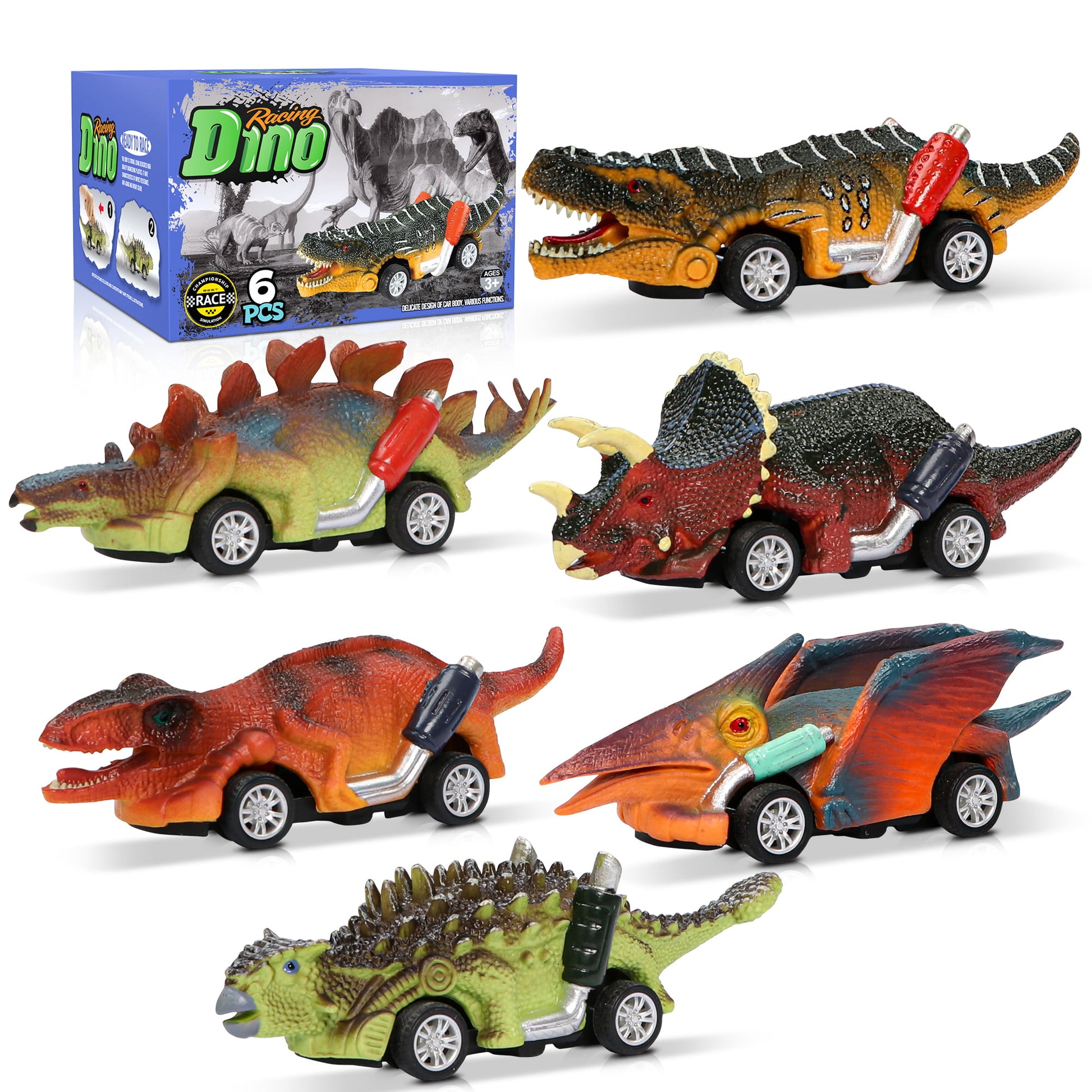 - 6-pack Dinosaur Cars:A collection of 8 artfully-crafted roadster dinosaur pull back toy cars make perfect dino toys for 3 year old boys.