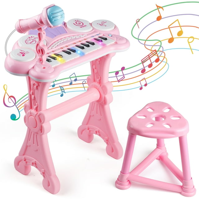 Beefunni Kids Electronic Piano Keyboard, 24-Key Kids Piano Music Toy, Birthday Gift for 3 4 5 6 Year Old Toddler Girls, with Microphone, Stool - Pink